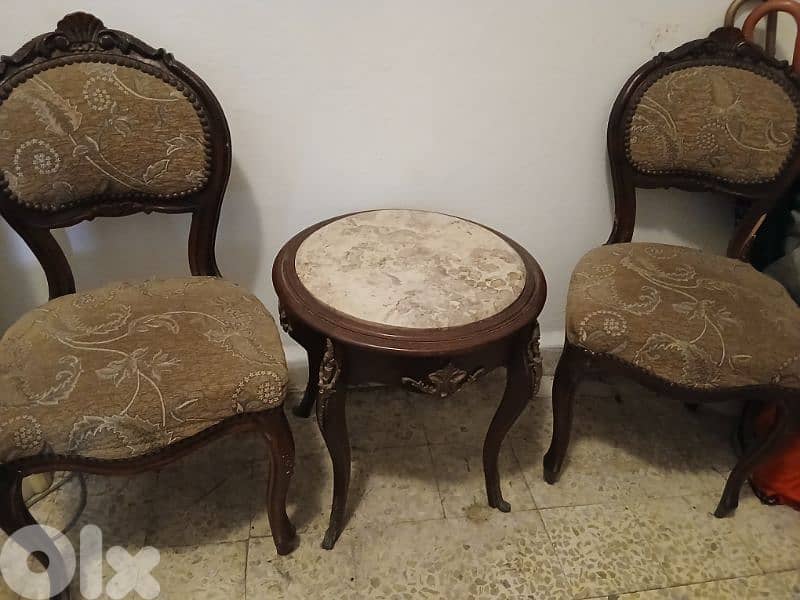٢ كرسي بيج وزيتي وطاولة انتيك. +٣ لوحات مميزين.