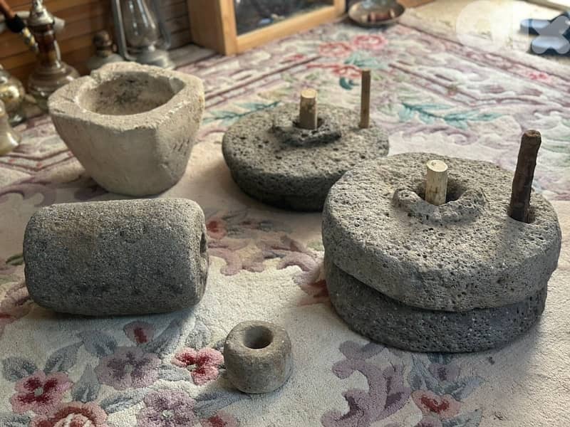 أدوات حجرية قديمة للاستعمال اليومي (جرن/هاون حجر + رحى طحن يدوية + حجر دقّ).