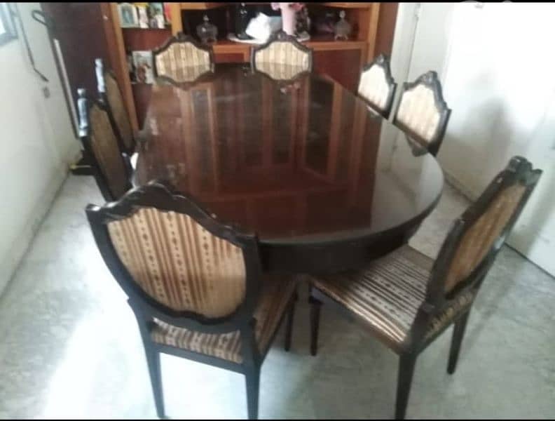 طاولة سفرة مع كراسيها صالون ستيل مخمل بوردو قطعة كبيرة و٤ صغار خزانة انتيك مع مرايه داخلية ورفوف وجارورين كبار بالأسفل. وخزانهكتب وصمد