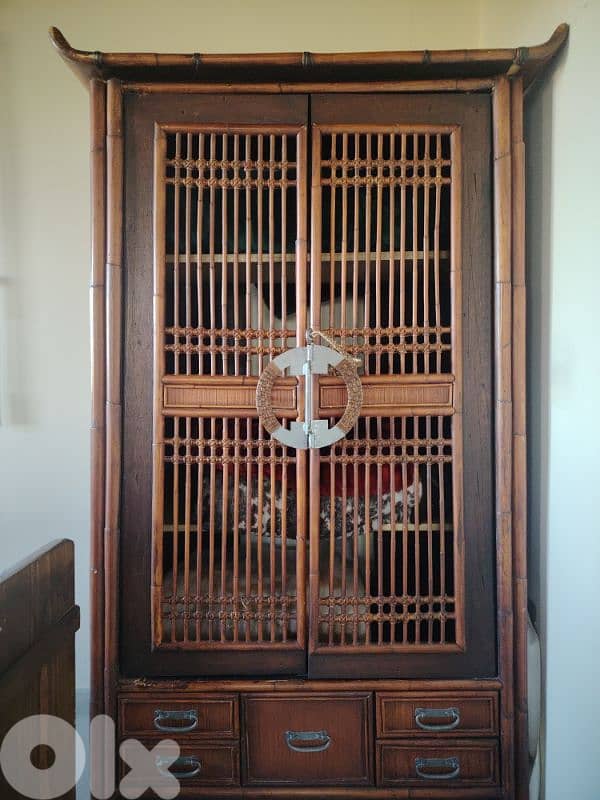يتوفر خزانتان أنتيك، مصنوعتان من القصب الأجنبي المحبوك يدويًا.