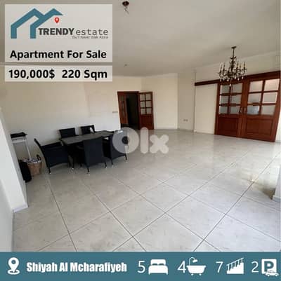 شقة بسعر مميز وبمساحة واسعة ، ضمن موقع مميز للبيع في المشرفية الشياح ، طابق سابع ليس الاخير يوجد مصعد 24/7 ، مساحة الشقة 220 متر مربع ، تتالف من اربع غرف نوم + غرفة جلوس + صالون صالة كبير وسفره ، مطبخ ، ،غرفة مساعدة منزل مع حمامها الخاص، بئر مياه + عيار مياه دولة، موقفين سيارة خاصين بالشقة تحت الارض، سند اخضر