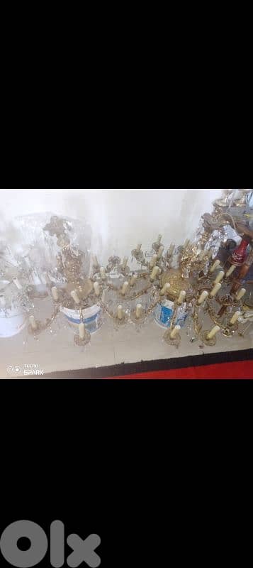 ثريات نحاس جداد من دبي بعدن بل علبه فيهن وزن حوالي 60كيلو وحدي 24 لمبه وتانيه 16 لمبه شركه