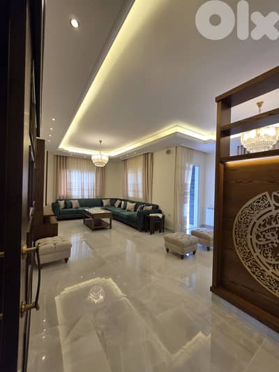 طابق أرضي: صالونان و سفرة مع شرفة كبيرة مطلة و ديكورات جفصين عامة و إنارة مخفية، مطبخ راكب فيه خزائن خشبية مع طاولة سفرة و تراس كاشف، غرفة نوم و حمام ضيوف.