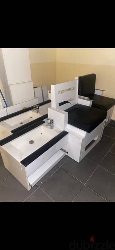 مغاسل شبه جديد مستعمل سنة فقط و مقاعد و جوارير و خزانات للعناية بالأرجل و الأظافر