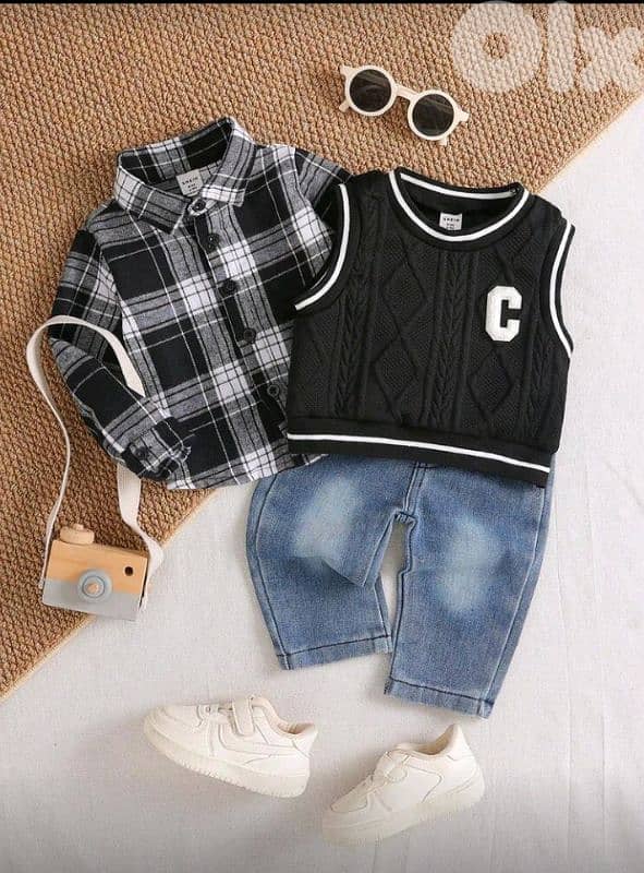 s 3 قطع طقم ملابس عادية للأولاد الرضع: صدرية مطبوعة + ملابس علوية كم طويل مربع + بنطلون جينز، صدرية مطبوعة بحرف إنجليزي قديم مع ملابس علوية علوي بياقة وأزرار فرديمغسول، مناسب للارة،طاني