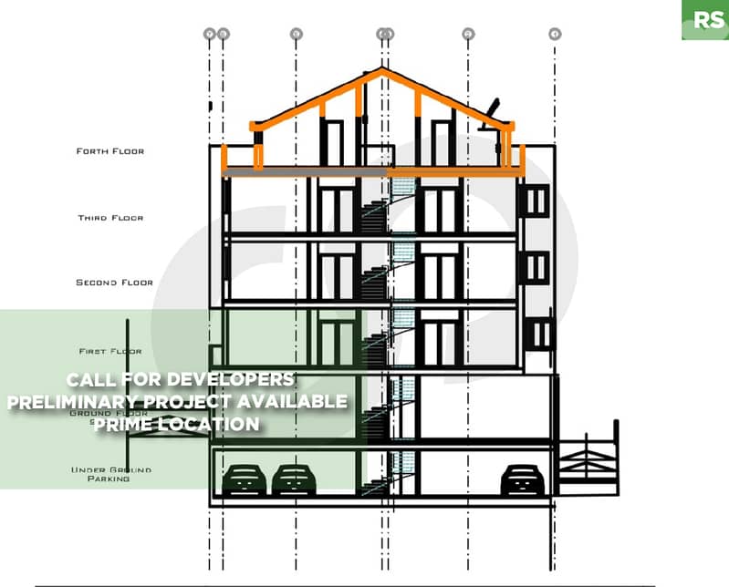 تصميم أولي متاح لمبنى يضم موقف سيارات تحت الأرض وطابقًا أرضيًا يضم متاجر، وثلاثة طوابق سكنية تضم شقتين في كل طابق، وسطحًا.
