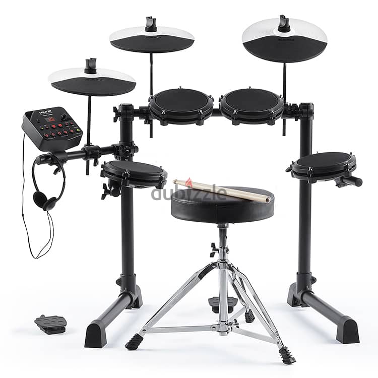 Playing drums has never been more accessible! Introducing the Debut Kit by Alesis, a complete electronic drumming system in one box. This is no toy – the Debut Kit comes with absolutely everything you need to start drumming right away. First, there are the drums themselves - (4) 6” adjustable mesh-head drums that feel great without any of the noise that comes with rubber e-drum pads. Each one of the (3) included cymbals boasts a large 10” playing surface so you never miss a beat. The Kick drum and Hi-Hat are controlled by responsive foot pedals that can be rolled up and put away while not in use and the adjustable drum throne and headphones provide comfort for players of all ages. Did we mention that drumsticks are included too? The Debut Kit is the perfect package for any aspiring drummer.