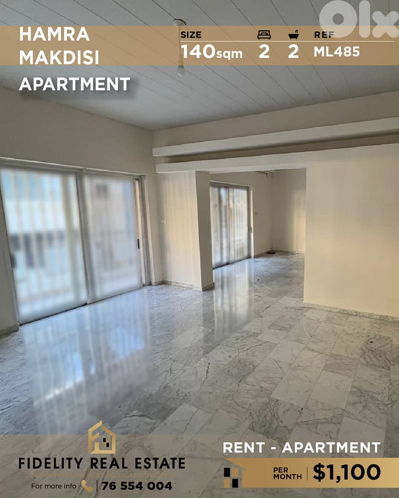 شقة غير مفروشة للإيجار في الحمرا/المقدسي، مساحتها ١٤٠ مترًا مربعًا، رقم المرجع: ML485