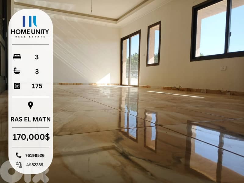 This 175 sqm 3-bedroom appartment , including 1 master bedroom(s) is available for sale in Ras El Matn, Metn, Located on the ground floor, the property features 3 bathroom(s) The property includes 1 parking space. and is situated in a modern building. Deed status is Green Bond. Current condition of the property is Ready to move in.