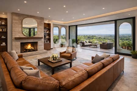 صالون كبير وغرفة سفرة مع إطلالة ومدفأة