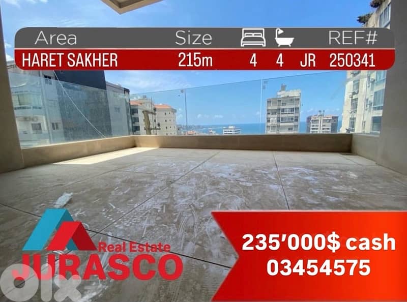 شقة للبيع في منطقة حارة صخر مساحة 215 متر بإطلالة مفتوحة، ضمن بناء حديث عمره 6 سنوات.