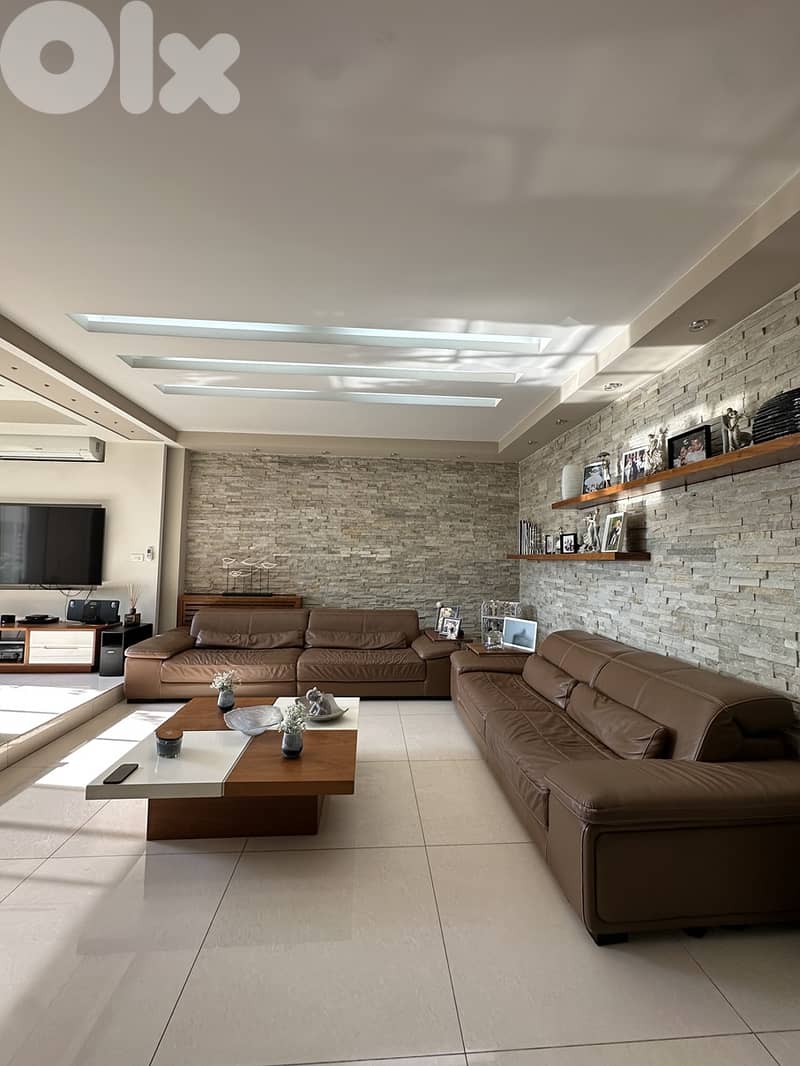 The building is grand & elegant, set on a calm, secluded and peaceful site in BSALIM. The residence is unfurnished and it is graceful and an expression of luxury & modernity with high standard specification. Has an area of 210 sqm and a complementary charming 280 sqm garden & terrace perfect for enjoyment and relaxation. Features 1 master bedroom, 2 regular bedrooms, common bathroom, guest toilet, 2 salons, dining room, eat-in gourmet kitchen, laundry space and maid’s room with bathroom. 2 underground parking spots. Several amenities among which Heating/Cooling systems, ceramic floors, chimney, solar system (16 panels), stone & wood deco, gypsum ceiling, deco lighting, electric roller shutters, video phone, double wall, double glazed windows, stone cladding and concierge services.