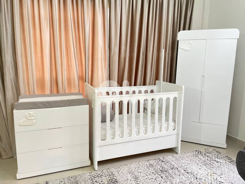 Baby bedroom Used like new (few months only) Chiffoniere: 80cm-40cm-80cm Bed: 127cm-70cm-100cm (with drawer) Closet: 84cm-40cm-181cm