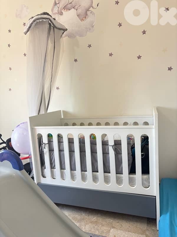 1. Baby bed with two levels and one side removal option + one drawer + mosquito net