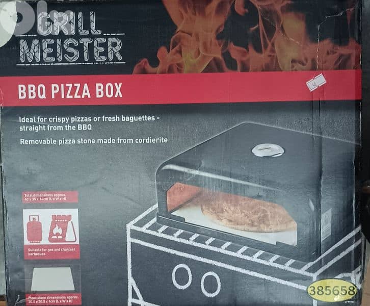 Grill Meister BBQ Pizza Box oven, which transforms a gas or charcoal barbecue into a pizza oven. Ideal for crispy pizzas or fresh baguettes straight from the BBQ. Removable pizza stone made from cordierite. Integrated thermostat for easy temperature control. Dimensions: Approximately \(40\text{cm}\times 35\text{cm}\times 14\text{cm}\) (L x W x H).