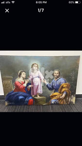 Early 20th century oil on canvas painting size 100x65 cm without frame subject “the Holy Family” Jesus Mary and saint Joseph, signed H. Srour and dated 1910 attributed to the famous late pioneer artist Habib Srour who once was in charged of painting all churches domes and fresques during the period of Patriarch Elias Howayek. A mega rare painting to find.