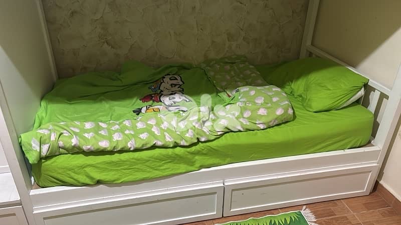 This is a white wooden twin-over-twin staircase bunk bed with storage drawers. for more information call 70123667