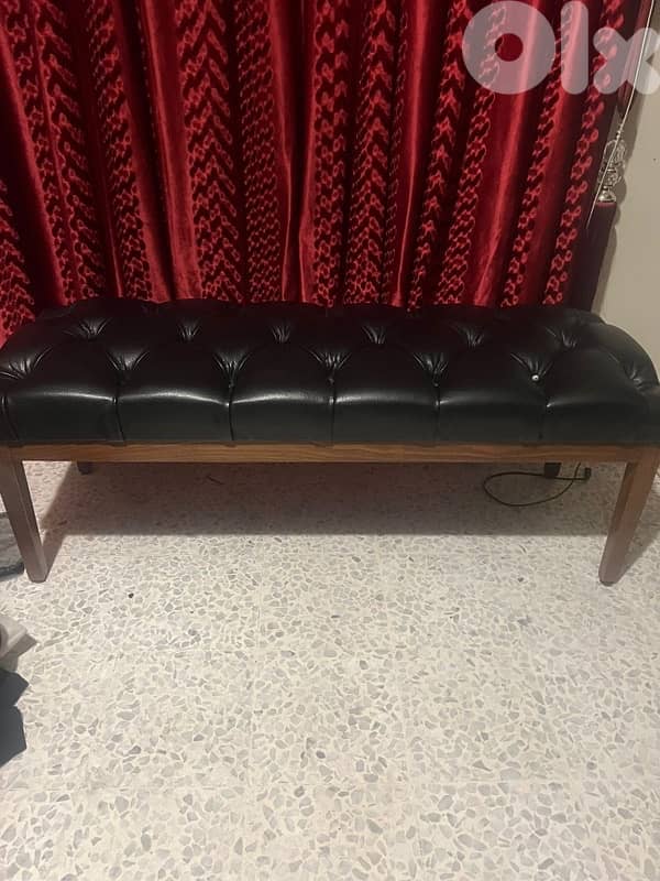 كنبة لون أسود بتصميم فاخر (كابيتونيه) مع قاعدة خشب قوية، مريحة وعملية. شبه جديدة جلد عالي الجودة مناسبة للبيت أو المكتب