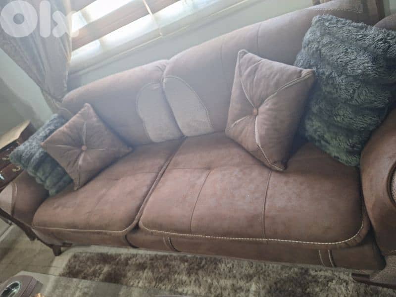 2 large brown sofas with pillows 2 brown chairs Very comfortable كنبتان كبيرتان باللون البني مع وسائد كرسيان باللون البني مريحة جدًا