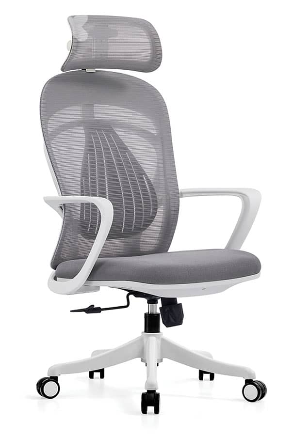 The Sovereign Mesh High-Back (Light Grey): A masterclass in ergonomic engineering, featuring a synchronized tilt mechanism, adjustable headrest, and a split-back lumbar support system in a sophisticated light-grey finish.