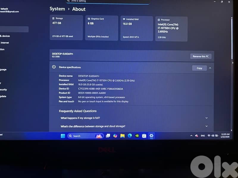 Dell G3 3500 Intel(R)core(TM) [redacted email address] Ram 16 GB Storage 512 SSD (NVMe) NIBIDIA GeForce RTX 2060 6GB 71669464