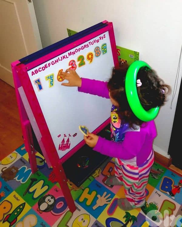 You can draw with chalk or markers — one side is a classic blackboard, the other is a whiteboard.
