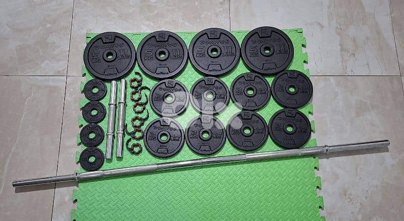 1 bar 8kg = 8kg 2 bars 2kg each = 4kg 4 plates 5kg each = 20kg 8 plates 2kg each = 16kg 4 plates 1kg each = 4kg Total 52kg