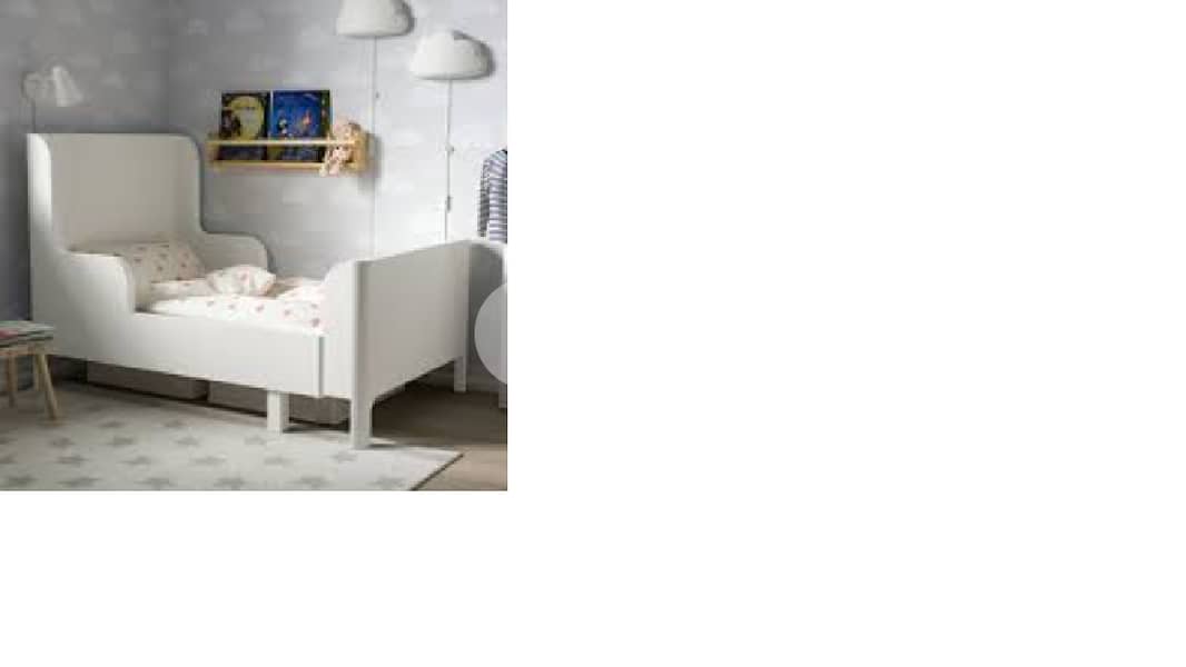 This is an extendable bed from Ikea. It comes in white wood color with a mattress and an extension to the mattress when the bed is extended. It's perfect for kids as young as 3 years old. The width is 90c,m and when extended, the length is 200 cm.