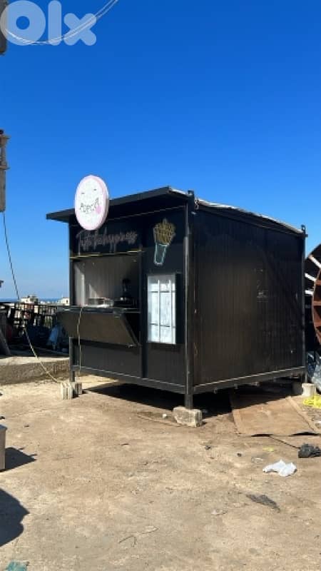 kiosk 3m*3m mbalat fi emdedet kahraba w shaffat, w hood stainless steel 280 cm, fi no2at kahraba mwaza3a fi w tablo dejenterat, mn bara fi box light lal menu ma3 raf lal zabeyen , mn wara fi box hadid la aninet l gas mjahaze la tet2afal w mkhara2 la emdedet gas 3 makharej mn juwa la ynehat makanet 3 output. akid bala makanet