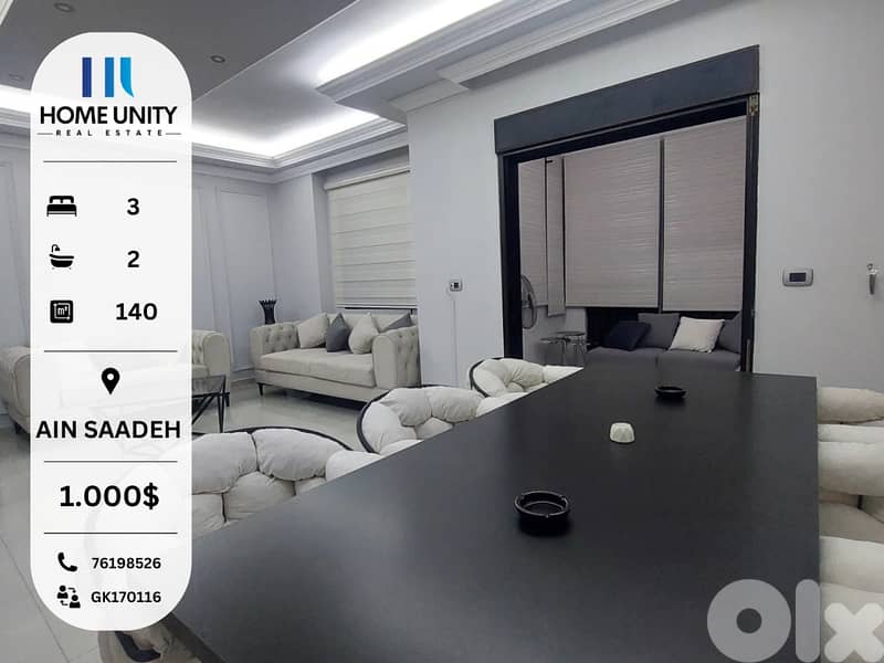 This 140 sqm 3-bedroom appartment is available for rent in St elie, St elie, D, Ain Saadeh, Metn, Located on the 1st floor, the property features 2 bathroom(s) The property includes 3 parking spaces. Furnished and is situated in a modern building.