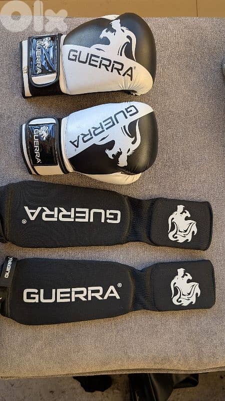 12 oz boxing gloves and large size shin guards. I'm 178cm and 70kgs for reference. they fit very comfortably and are in great condition.