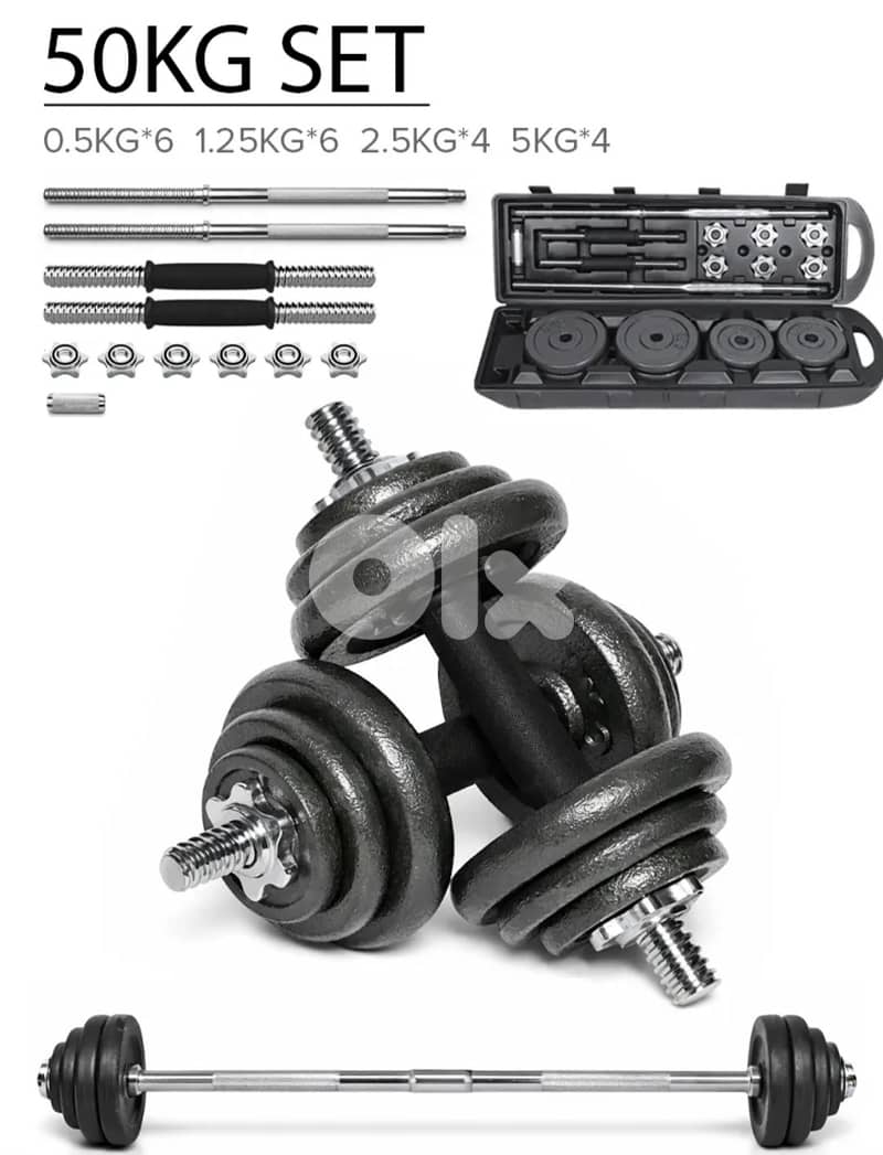 This product is a new iron gym set of 2 dumbells (1 kg each) and 2 small irons (2 kg each) that can be strongly connected by an iron screw to form a bar of 4 kg. In addition, iron weight plates are also included consisting of 4 plates of 5 kg, 4 plates of 2.5 kg, 6 plates of 1.25 kg, and 6 plates of 0.5 kg making a sum of 40.5 kg of weight. Moreover, all these products are placed perfectly with all there needed connectors in a displaceable wheeled storage case. With this set you can have your own gym at home just for 150$.