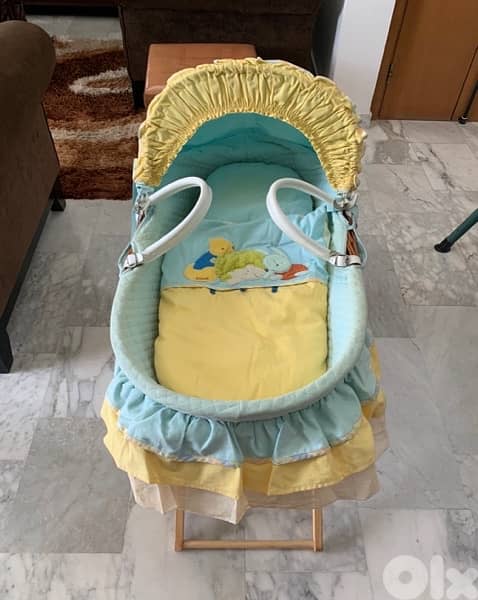 -The baby bed has a wooden stand and a veil. In excellent condition