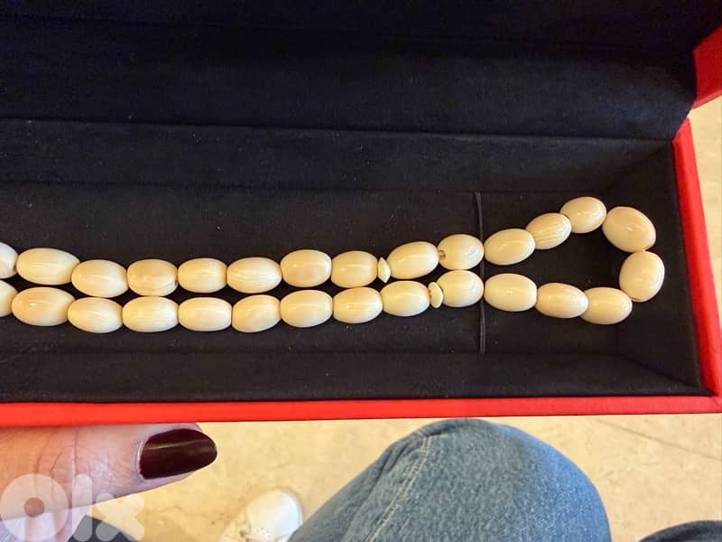 Elegant ivory misbaha featuring smooth oval beads in a natural creamy tone. Simple, classic, and refined piece suitable for daily use or collection. Well preserved and kept in its box. Serious buyers only.