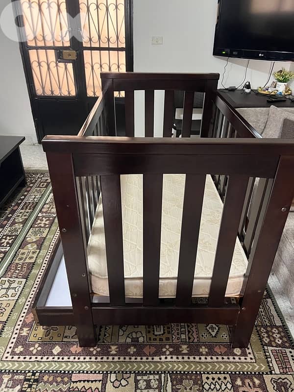 kid bed solid wood in very good condition with drawer and barrier up and down with 2 mattresses