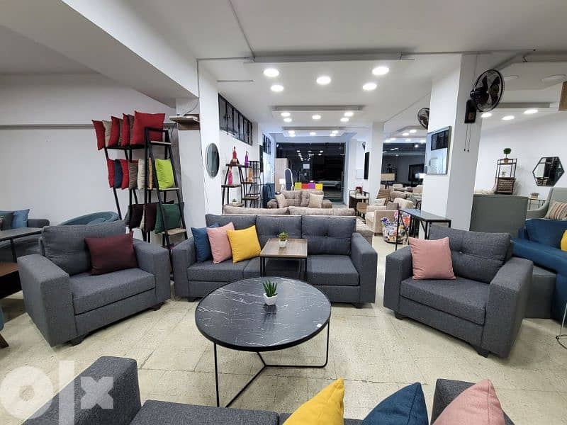 Living room or Salon. 3 places + 1 place + 1 place delivered with Cushions. Extra Quality Foam. Customize color & Places. غرفة جلوس أو صالون. ٣ مقاعد + مقعد + مقعد. مع وسائد ملونة. امكانية تعيل المقاسات وتغيير اللون.