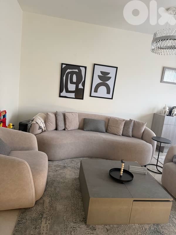 full living room 1 big sofa 3 seats 2 armchair center table with two drawers