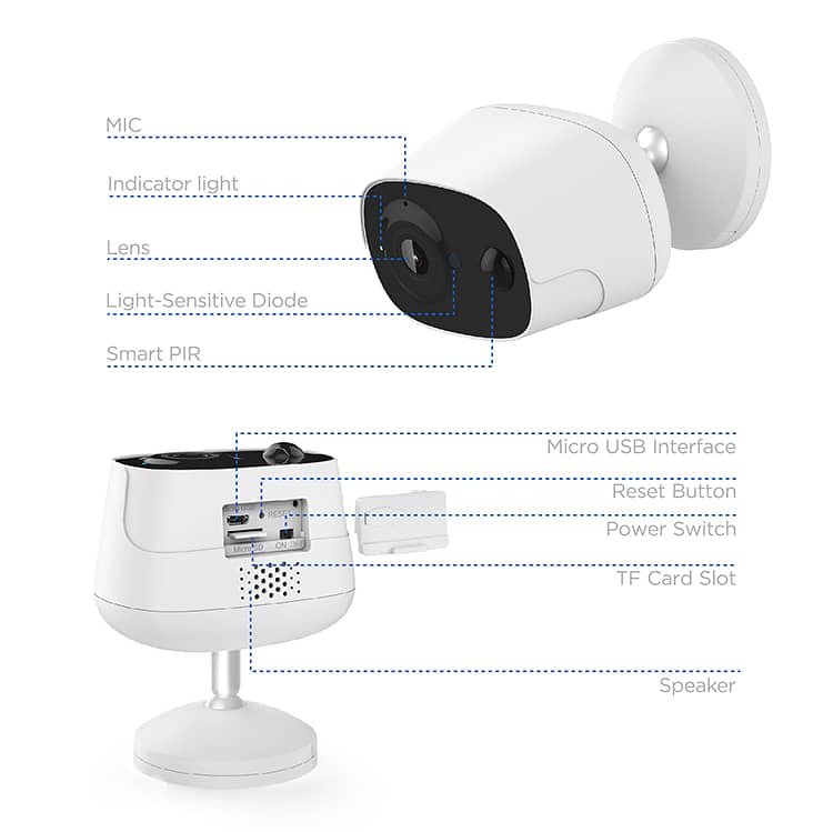 This low-power wireless camera delivers 3MP HD resolution (2304×1295) with a 145° ultra-wide viewing angle, powered by a 5200mAh/6400mAh lithium battery or optional 5V/3W solar panel for continuous operation. Featuring AI human detection, PIR motion sensing, and 7m infrared night vision, it sends real-time alerts via the Tuya app. The IP65-rated waterproof housing, while its compact design (84×60×98.5mm) ensures discreet placement.
