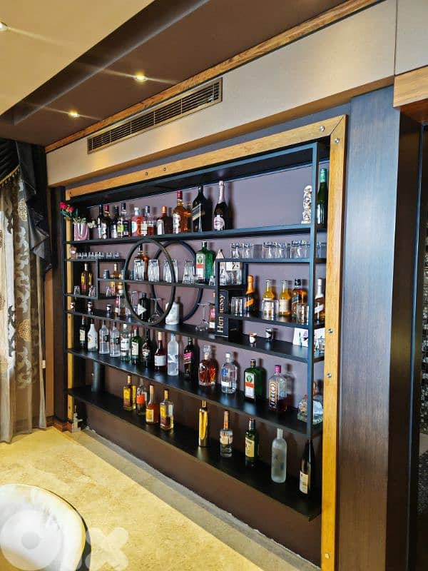 Premium wood and black metal frame with multiple shelves for bottles and glasses.