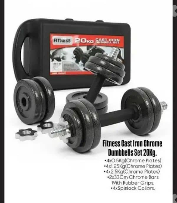 New Fitness Cast iron Chrome Dumbbells Set 20kg. Description: 4x0.5Kg(Chrome Plates) 4x1.25Kg(Chrome Plates). 4x2.5Kg(Chrome Plates) 2x33Cm Chrome Bars With Rubber Grips. 4xSpinlock Collars. Delivery Available