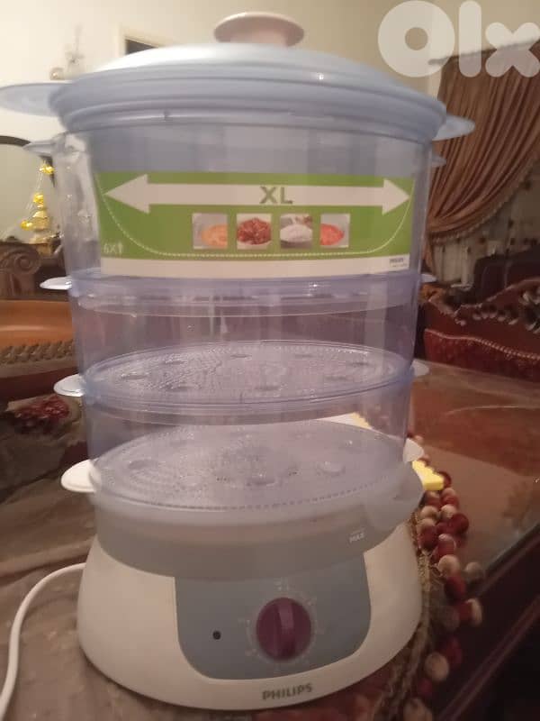 philips آلة طهي على البخار . مستعملة مرة وحدة فقط . فيكن تعيرو الوقت و بس يخلص برن الجرس . كتير عمليّة فيك تحط كذا طبخة بقلبها