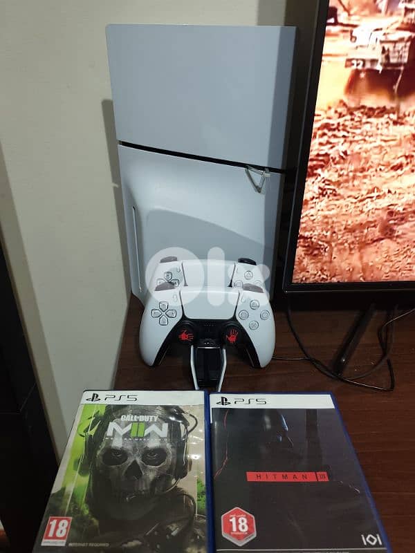 Ps5 slim with 2 original controllers and charger dock ma3 2 games mw2 hitman 3