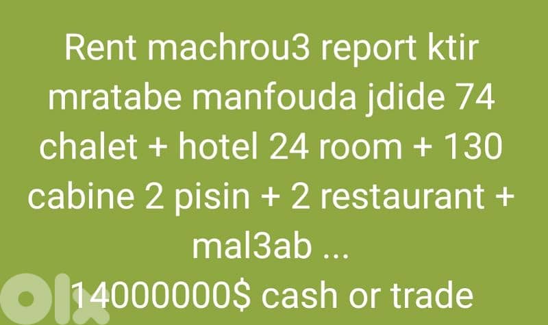 Rent machrou3 report ktir mratabe manfouda jdide 74 chalet + hotel 24 room + 130 cabine 2 pisin + 2 restaurant + mal3ab . . . 14000000$ cash or trade