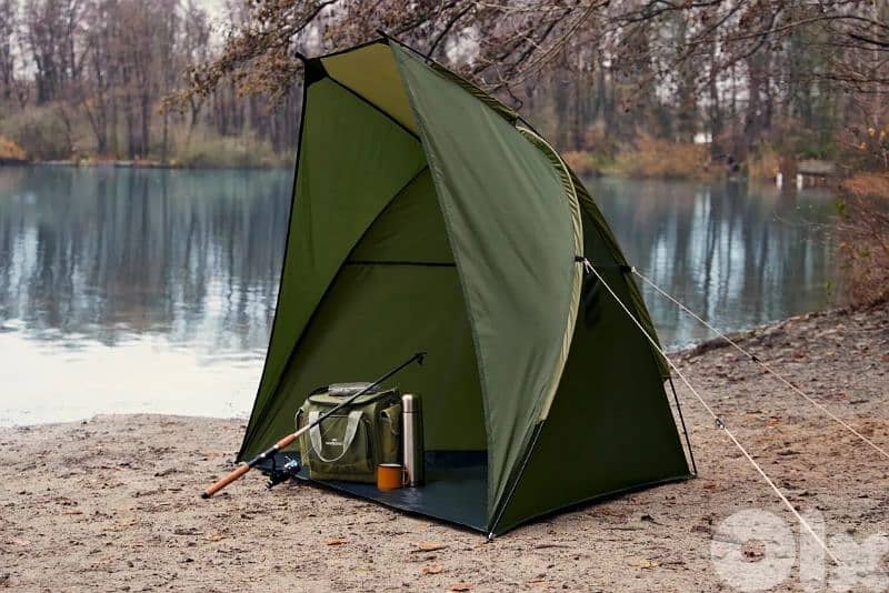 Ideal weather protection when fishing - protects from sun, wind, and rain. Quick and easy to set up. Made of durable, water-repellent polyester fabric with UV protection factor (UPF) 60 according to UV801 standard. Tent pegs, guy ropes, storage bag, and assembly instructions included.