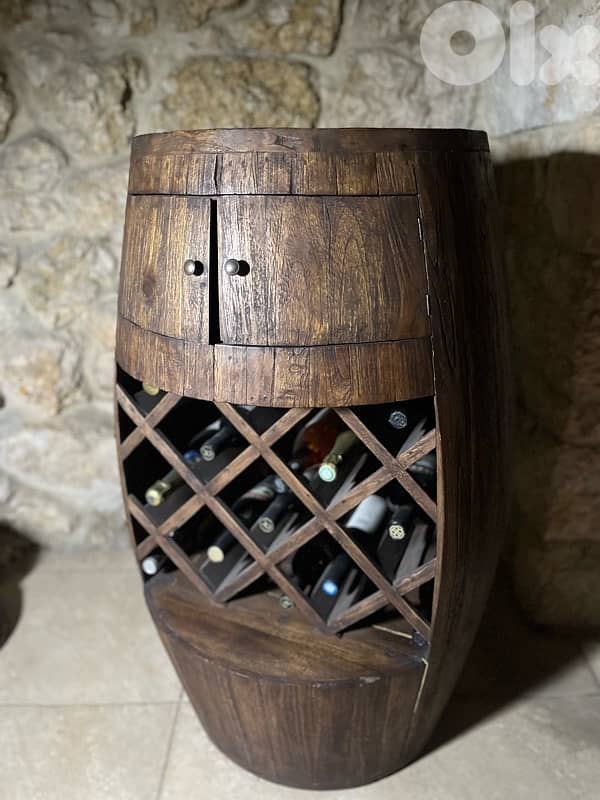 خزانة نبيذ ريفية مصنوعة من خشب صلب ومصممة على شكل برميل كلاسيكي، تتميز برف داخلي متقاطع لتخزين الزجاجات وخزانة علوية توفر مساحة إضافية. يظهر عروق الخشب الغنية والطبقة الطبيعية جمال القطعة، مما يجعلها عملية وجذابة من الناحية الزخرفية. يعود تاريخها إلى أواخر القرن العشرين، وهي بحالة جيدة جدًا مع آثار استخدام خفيفة تتناسب مع العمر والاستعمال.