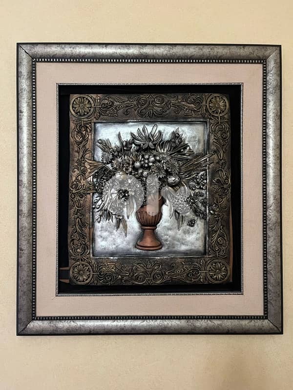 لوحة فنية مميزة جداً تعطي فخامة وحياة لأي مكان توضع فيه. تتميز بتصميم الورد البارز الذي يعطي شكل ثلاثي الأبعاد ملفت للنظر. ألوانها كلاسيكية وراقية، ومناسبة جداً للصالون أو المكاتب.