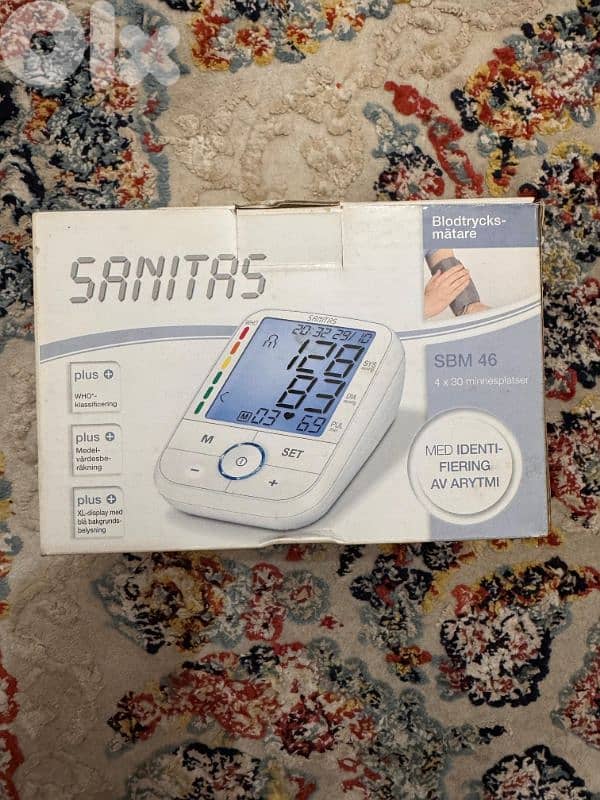 للبيع جهاز قياس ضغط Sanitas SBM 46 جهاز ألماني أصلي لقياس ضغط الدم على الذراع دقيق وسهل الاستعمال شاشة كبيرة وواضحة مع إضاءة حفظ قياسات (لأكتر من مستخدم) بيكشف عدم انتظام ضربات القلب تصنيف WHO للضغط الحالة:جديدة