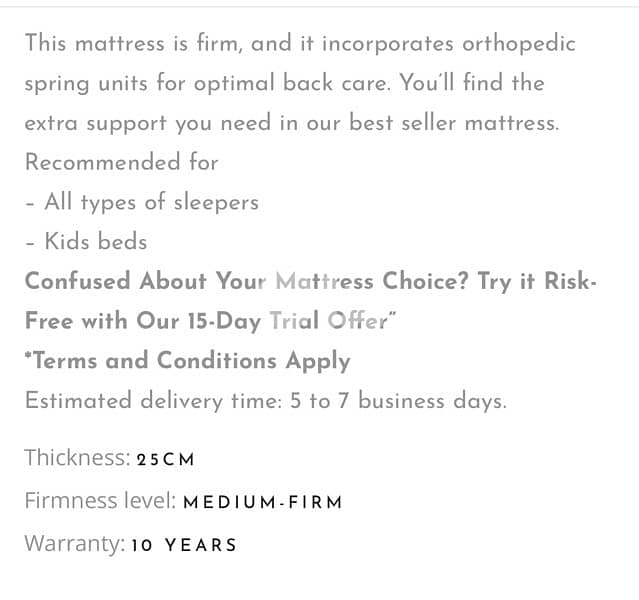 I used it only for 5 years . the firmness is medium to firm 120x195cm it’s feels like new I’m only 50kg. I’m selling it bcz I’m changing my size of bed it’s very comfortable!