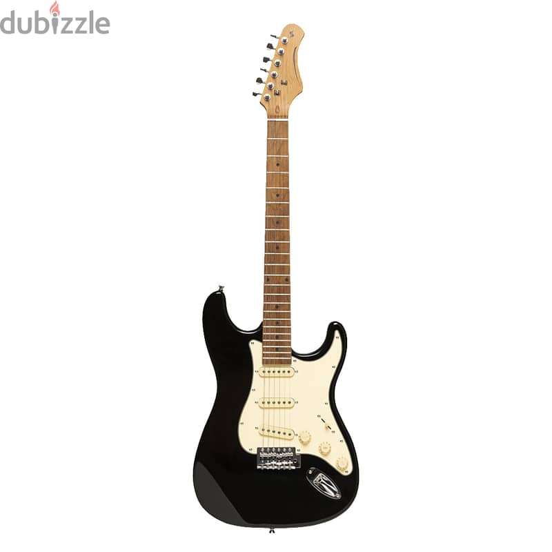 Stagg SES-55 electric guitar from the Vintage S series with a body made of solid Paulownia and 3 single Alnico pickups with a special Black color