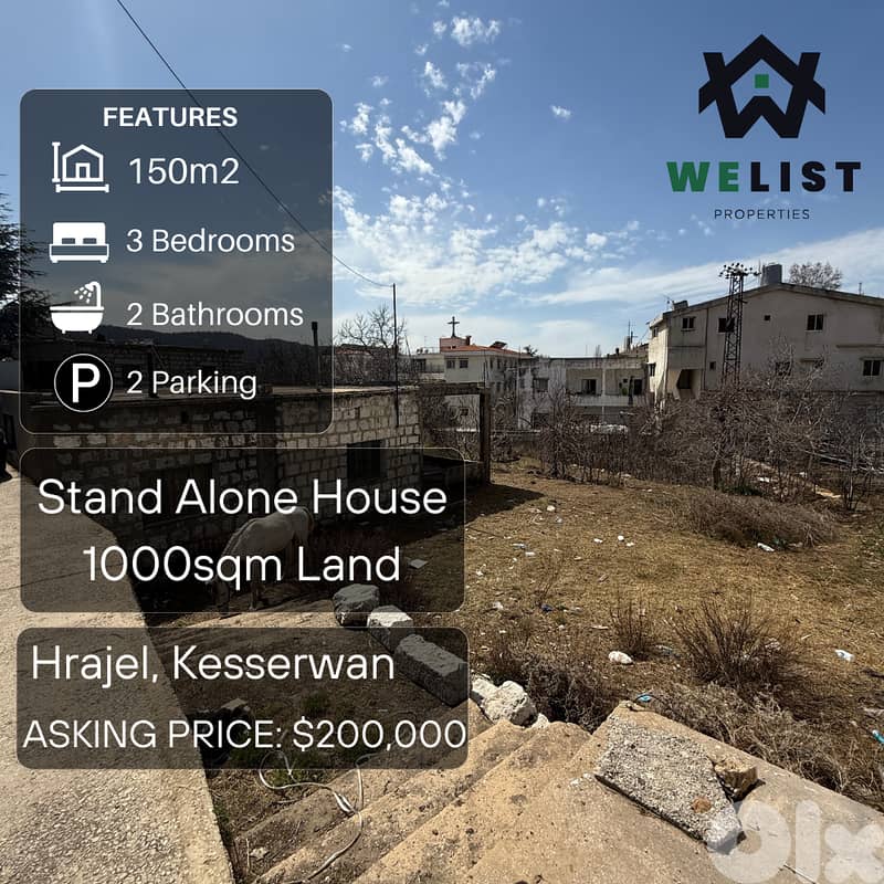 ١٥٠م منزل مستقل على ارض ١٠٠٠م للبيع في منطقة حراجل ، كسروان